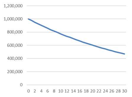 下図は、毎年2.5%ずつ目減りした場合、100万円の価値がどのように変化するかを表しています。